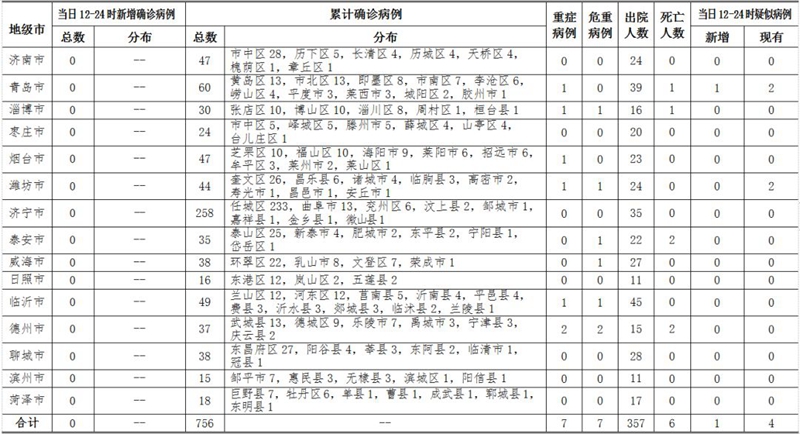 2020年2月25日12-24时,山东省无新增新型冠状病毒肺炎确诊病例,累计确诊病例756例(含重症病例7例,危重症病例7例,治愈出院357例,死亡病例6例);新增疑似病例1例,现有疑似病例4例。截至目前,追踪到密切接触者16744人,已解除医学观察15206人,诊断为疑似或确诊病例291例,尚有1247人正在接受医学观察。 详见下表(单位:例):备注:根据要求,按病例确诊时医院所在县区统计。责任编辑:徐珍