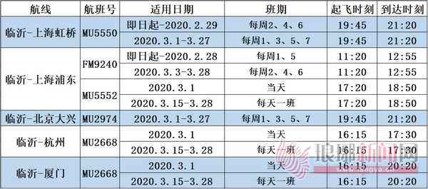 为配合各地复工复产需求,临沂机场近日适时恢复开通部分城市航班,具体如下: