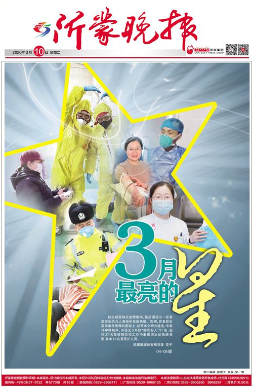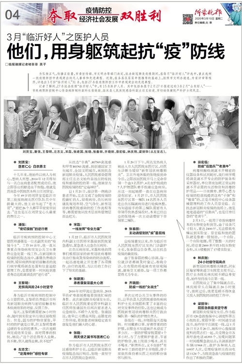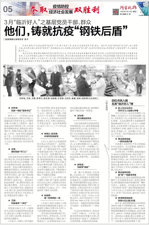 为弘扬正气,传播正能量,临沂市委宣传部、市文明办等部门决定,抗击新冠肺炎疫情期间,在每月“临沂好人”评选中,重点选树一批疫情防控中表现突出的凡人善举和先进典型。近期,在各县区层层申报推荐的基础上,按照市文明办遴选、专家评审等程序,评选出3月份“临沂好人”31名,包括27名在疫情防控工作中表现突出的先进典型。【她们用身躯筑起抗“疫”防线 3月“临沂好人”之医护人员】【他们,铸就抗疫“钢铁后盾” 3月“临沂好人”之基层党员干部、群众】责任编辑: