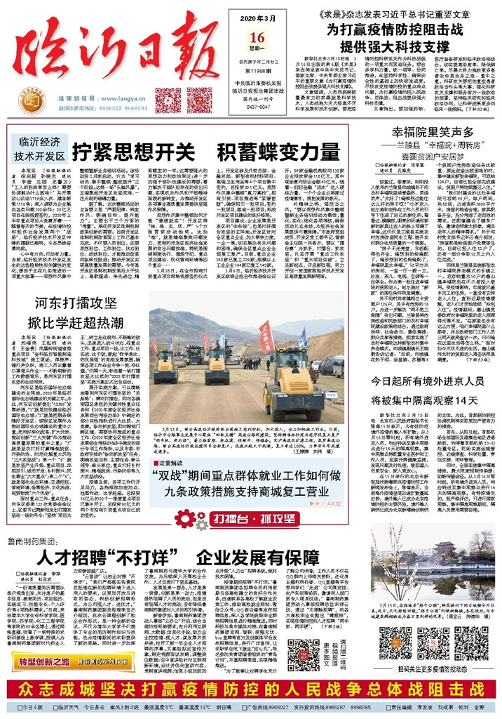 “工人的到岗率怎么样?需要协调解决什么困难?”共开展谈心谈话1719余人次、建言献策1116条;深入调研为企业解决各类问题100余件;20亿元项目在线视频签约,2020年上半年重点项目大竞赛开赛……踏着春天的节奏,在疫情防控和经济社会发展两个“战场”,临沂经济技术开发区冲锋的擂鼓已敲响,斗志昂扬奋勇向前。