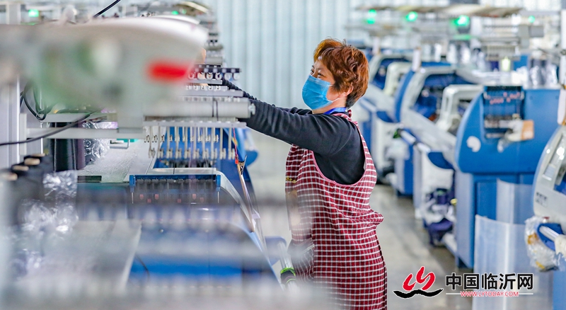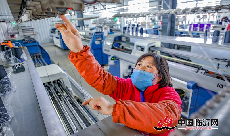 沂南县枣林庄村扶贫车间王爱珍在飞织机上忙