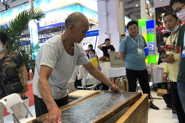 “桑皮纸以桑树的嫩皮为原料制成…”在临沂馆非物质文化遗产展区,63岁的老者杨启余正现场展示桑皮纸的制作过程,该纸呈天然乳白色,质地柔韧,据杨启余介绍老纸只要保存得当,干透的桑皮纸千年不褪色,因此有着“千年老纸”的美誉。