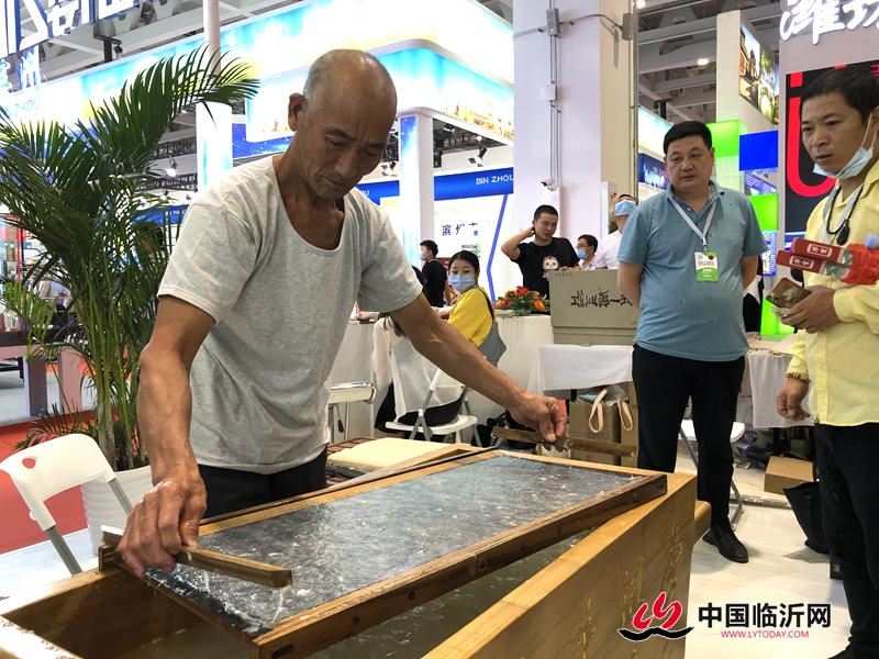 “桑皮纸以桑树的嫩皮为原料制成…”在临沂馆非物质文化遗产展区,63岁的老者杨启余正现场展示桑皮纸的制作过程,该纸呈天然乳白色,质地柔韧,据杨启余介绍老纸只要保存得当,干透的桑皮纸千年不褪色,因此有着“千年老纸”的美誉。