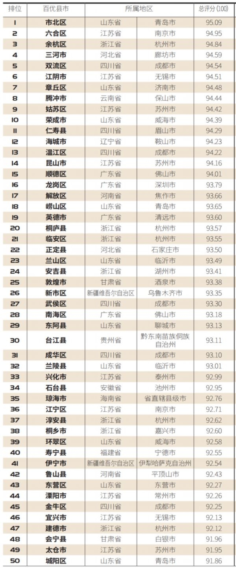 青岛市市北区(第1)、济南市章丘区(第7)、威海市荣成市(第10)、青岛市崂山区(第18)、临沂市兰山区(第23)、聊城市东阿县(第29)、临沂市兰陵县(第32)、威海市环翠区(第39)、东营市东营区(第43)、青岛城阳区(第50)、威海市乳山市(第52)、淄博市博山区(第59)、烟台市莱州市(第70)、临沂市蒙阴县(第81)、烟台市牟平区(第85)、临沂市沂南县(第91)、威海市文登区(第93)、临沂市莒南县(第97)。