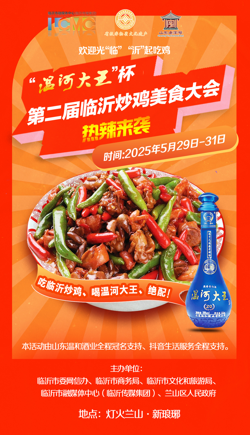 中国临沂网讯 欢迎光“临”“沂”起吃鸡。“温河大王杯”第二届临沂炒鸡美食大会热辣来袭!5月29日,灯火兰山·新琅琊,让我们一起享炒鸡盛宴。这是一场味蕾盛宴,非遗传承、绝配传奇,当鲜嫩鸡肉碰撞醇厚风味、当美食配上美酒,每一口都是临沂的热辣与豪爽。各地炒鸡风味齐聚,给你一场舌尖上的狂欢,各路炒鸡高手云集,究竟谁能征服你的味蕾?本活动由临沂市委网信办、临沂市商务局、临沂市文化和旅游局、临沂市融媒体中心(临沂传媒集团)、兰山区人民政府主办。山东温和酒业全程冠名支持。吃临沂炒鸡、喝温河大王、绝配! 本活动由抖音生活服务全程支持!