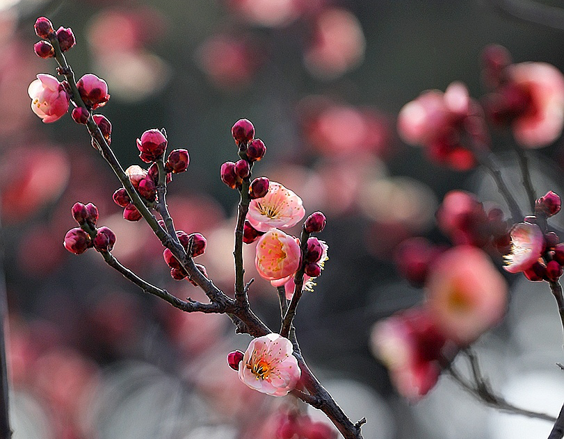 春節近く暖かさ増す、臨沂の沂河大橋付近で紅梅満開