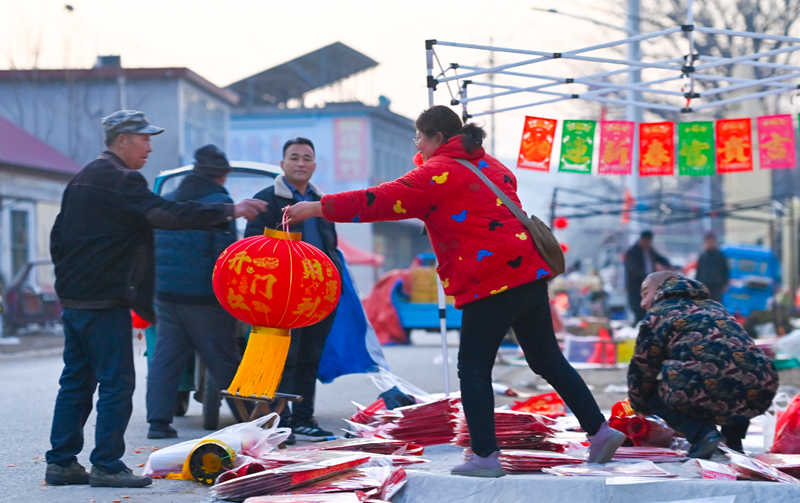 红彤彤的灯笼、喜庆的春联琳琅满目,村民们穿梭其间,精心挑选年货,处处洋溢着喜迎新年的欢乐氛围