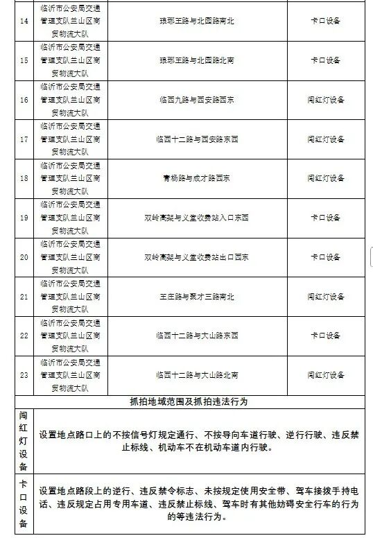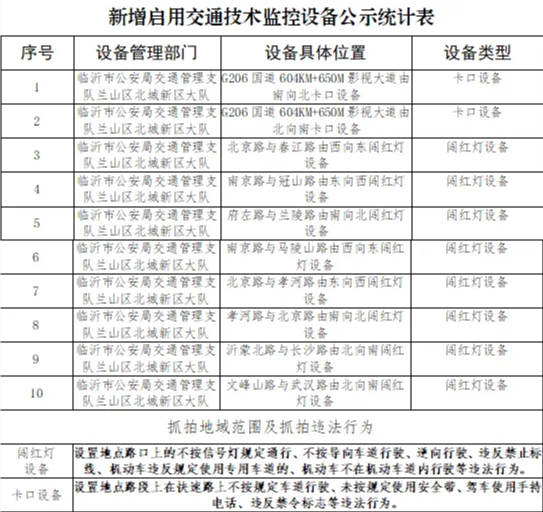 为进一步加强道路交通安全管理工作,规范通行秩序、预防道路交通事故,根据《中华人民共和国道路交通安全法》《中华人民共和国道路交通安全法实施条例》《山东省实施〈中华人民共和国道路交通安全法〉办法》《道路交通安全违法行为处理程序规定》等法律、法规规定,临沂市公安局交通管理支队兰山区北城新区大队新增启用辖区内共10套交通技术监控设备,现对以下设备予以公示,自公示之日起5个工作日后,将对有关交通违法行为进行依法管理,请广大交通参与者自觉遵守道路交通法律法规,共同维护良好的道路交通环境。