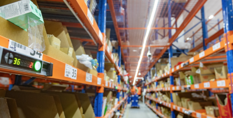 12月11日,先飞智慧物流临沂可好配送中心,工人根据电子标签分拣货物。