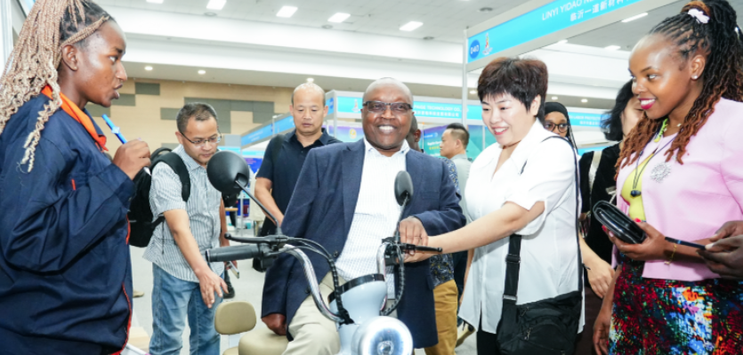 10月10日,肯尼亚内罗毕第二届中国(临沂)—肯尼亚国际商品展,一名肯尼亚政府官员正在体验临沂新能源企业展销的电动车。