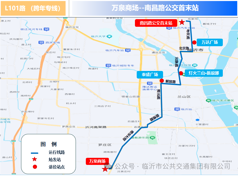 线路途经:L101路由罗庄区万泉商场发往南昌路公交首末站,途经通达南路、解放路、沂蒙路、北京路、孝河路、南昌路。串联泰盛广场、新琅琊、北城万达广场、齐鲁园广场等核心商业景点。