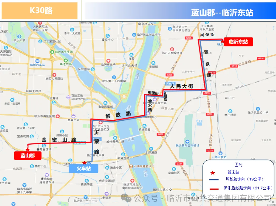 K30路优化调整后由蓝山郡发往临沂东站,主要途经工业大道、金雀山路、沂蒙路、解放路、金安路、安居街、正阳路、人民大街、温泉路、凤仪街等。