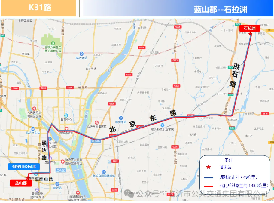 K31路优化调整后由蓝山郡发往石拉渊,主要途经工业大道、金雀山路、通达路、北京路、北京东路、洪石路等。
