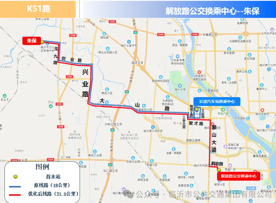 K51路优化调整后由解放路公交换乘中心发往朱保,主要途经开源路、解放路、蒙山大道、聚才路、工业大道、大山路、兴业路、创业路、戈九路等。