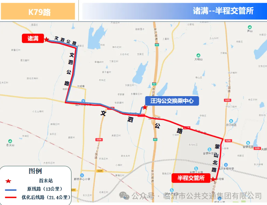 K79路优化后由诸满村发往半程交管所,主要途经文泗路、蒙山北路。