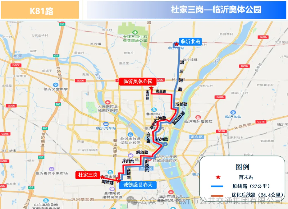 K81路优化调整后由杜家三岗发往临沂奥体公园,主要途经陶然路、兴隆路、金源路、商城路、开阳路、沂蒙路、解放路、琅琊街、祊河路、府左路、府右路、算圣路、上海路、顺和路、黄白河路、成都路、温凉河路、南昌路、孝河路等。