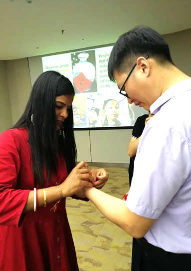 外国友人给朋友戴上五彩绳,并送上端午节的美好祝福。
