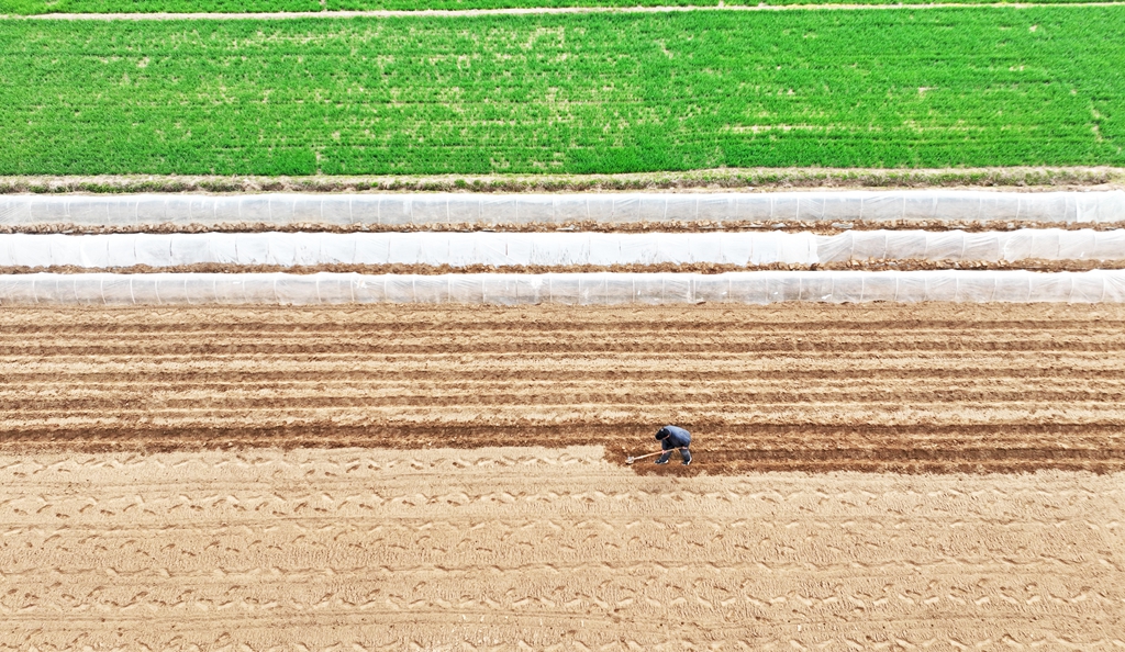 3月23日,在临沂市郯城县郯城街道,农民在田间劳作(无人机照片)。春分过后,山东各地农民抢抓农时开展春耕、春种、春管等农事活动,田间地头一派繁忙景象。